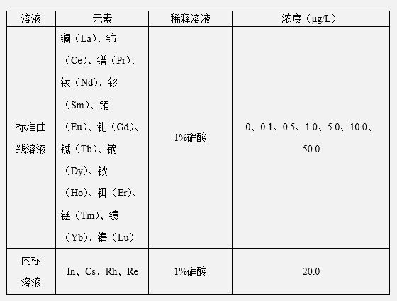 超纯水(电阻率≥18.2 MΩ·cm,25℃);硝酸(优级纯);盐酸(优级纯);铟、铑、铼和铯标准溶液(1000ug/mL,北京有色金属);16种稀土元素标准溶液(1000 ug/mL,北京有色金属)。