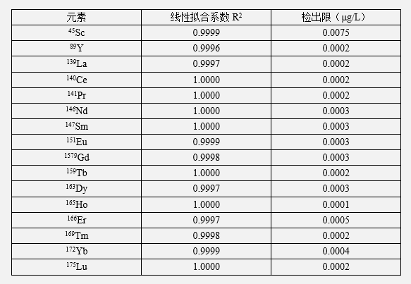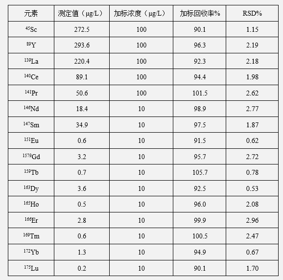 本方法采用EXPEC 7000电感耦合等离子质谱仪对肥料中16种稀土元素进行了分析。从实验结果来看,所建立标准曲线的线性系数均大于0.999;样品平行样分析结果RSD小于3%,每个元素采取合适的加标浓度进行加标测试,加标回收率都处于90%~106%之间。上述结果证明, EXPEC 7000可满足肥料样品中稀土元素的测定。