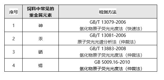 为防止重金属元素在饲料中的滥用,根据 GB 13078-2017 《饲料卫生标准》、GB 26418-2010 《饲料中硒的允许量》、GB 26434-2010 《饲料中锡的允许量》等对一些常见的重金属元素添加剂量和试验方法进行了明确的规定。