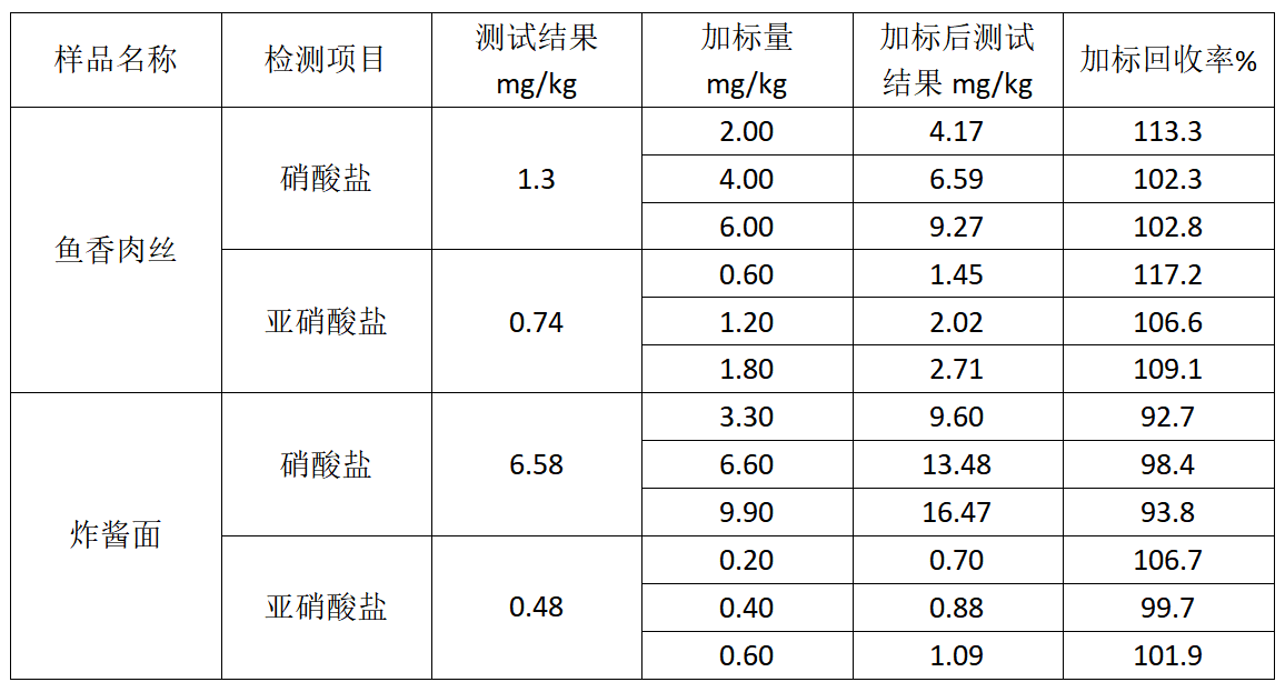 本文所述的预制菜中硝酸盐和亚硝酸盐分析方法,是使用香港六仺彩开奖绐果-香港6合开彩开奖-香港6合开奖结果+开奖记录2025-香港6合开彩开奖直播-香港六宝典资料大全-2025澳门今晚开奖结果-澳门马会会传真578866-澳门马会会传真576969的iFIA7全自动多参数流动注射分析仪测定,此方法测试硝酸盐线性相关系数为0.9999;硝酸盐定量重复性为 0.37%;硝酸盐加标回收率为92.7%-113.3%,亚硝酸盐线性相关系数为0.9999;亚硝酸盐定量重复性为 0.64%,亚硝酸盐加标回收率为99.7%-117.2%