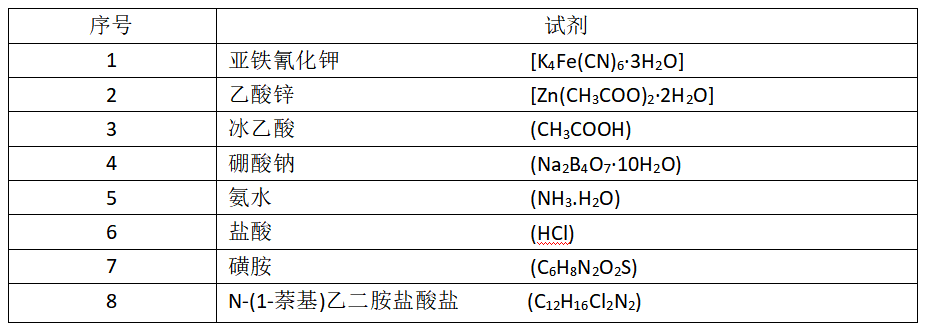亚铁氰化钾溶液(106 g/L)、乙酸锌溶液(220 g/L)、饱和硼砂溶液(50 g/L)、氯化铵缓冲溶液、磺胺显色剂。