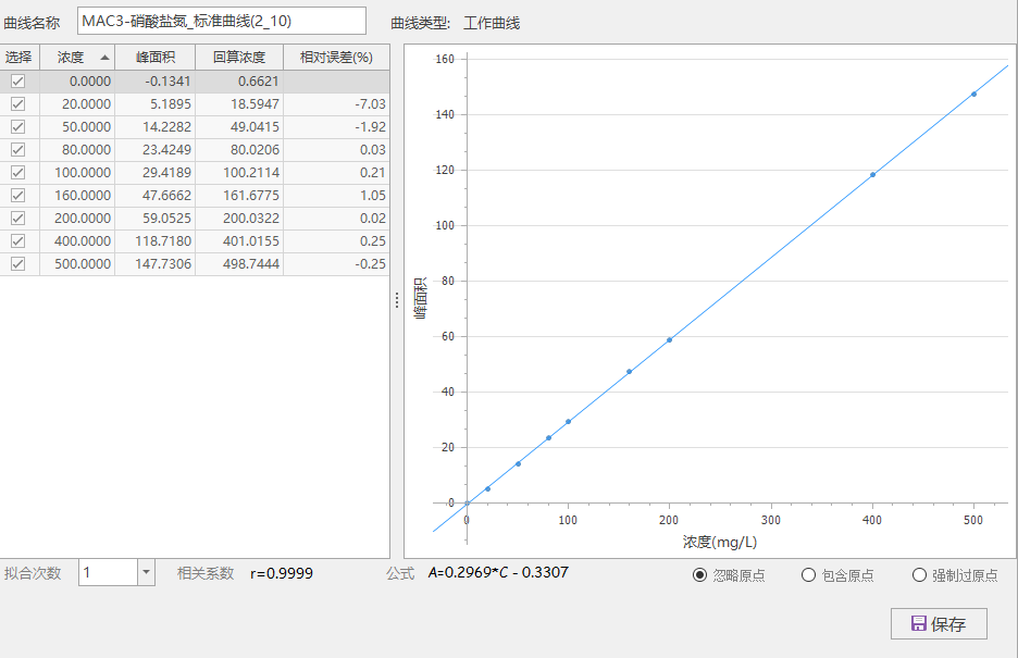将硝酸盐标准系列工作液(0μg/L、20μg/L、50μg/L,80μg/L、100μg/L、160μg/L、200μg/L、400μg/L、 500μg/L,以N计)分别进样,以浓度为横坐标,峰面积为纵坐标绘制标准曲线,硝酸盐线性方程及相关系数见表2,标准曲线见图 1,分析峰型图见图2。