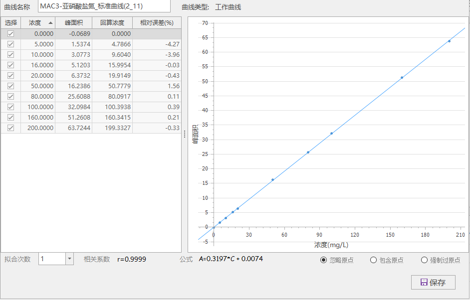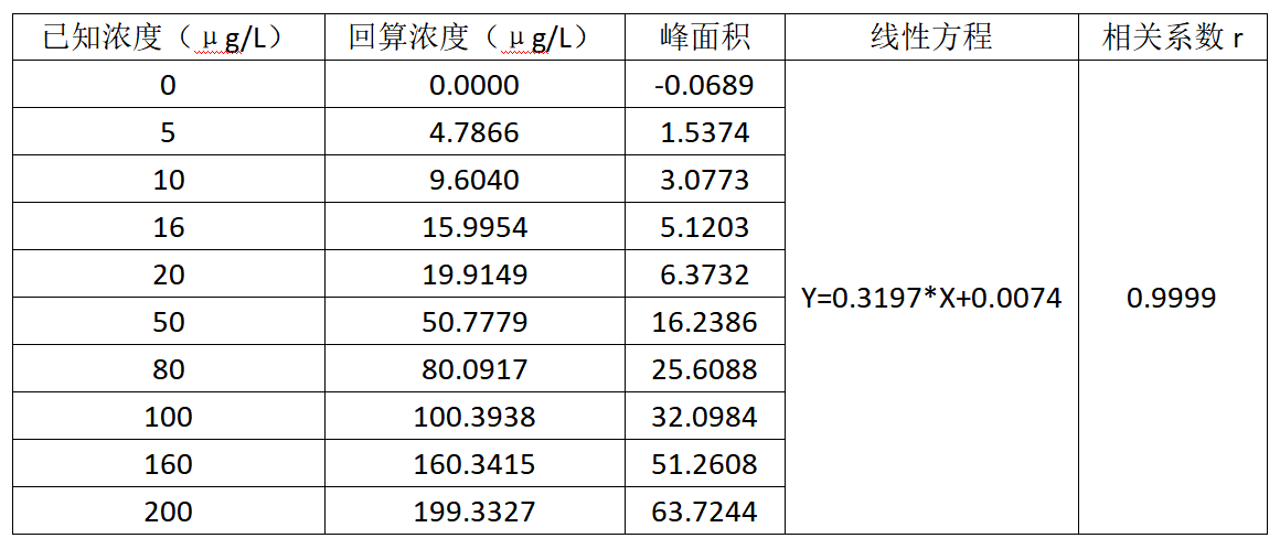 将亚硝酸盐标准系列工作液(0μg/L、5μg/L、10μg/L、16μg/L、20μg/L、50μg/L、80μg/L、100μg/L、160μg/L、200μg/L,以N计)分别进样,以浓度为横坐标,峰面积为纵坐标绘制标准曲线,亚硝酸盐线性方程及相关系数见表3,标准曲线见图 3,分析峰型图见图4。