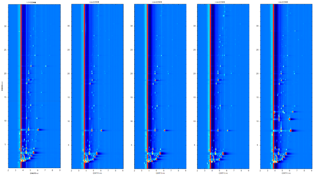 部分枸杞原浆原始谱图如下。谱图中各组分峰形及响应强度均较好,未出现明显共流出。GC-IMS 2000可以有效分离枸杞原浆中挥发性组分。