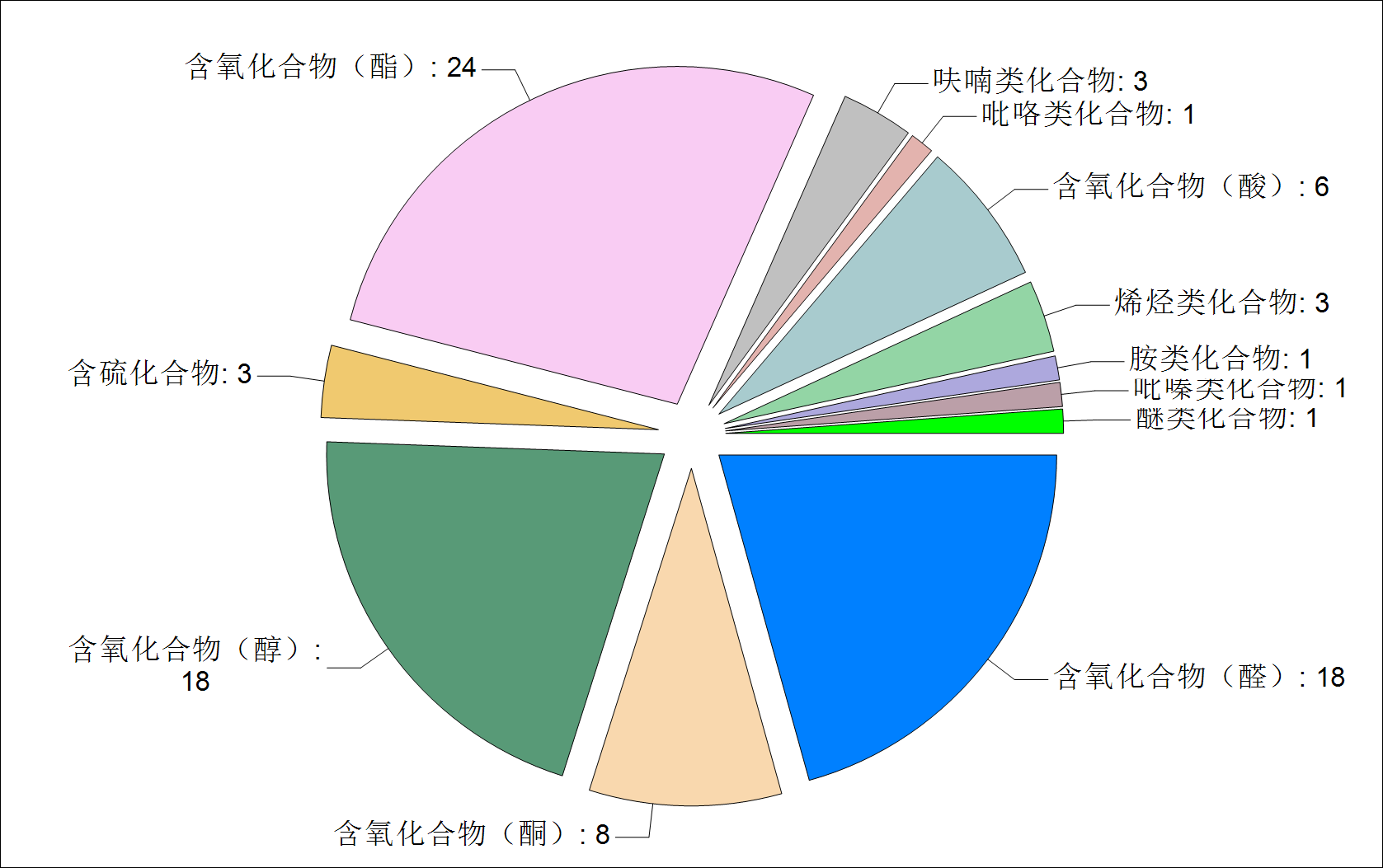 13个不同枸杞原浆样品中均检测出上百种组分,使用GC-IMS 2000自有库进行组分的定性。定性结果包括酯类化合物24种,醇类化合物18种、醛类化合物18种、酮类化合物8种、酸类化合物6种、呋喃类化合物3种、烯烃类化合物3种、含硫类化合物3种、醚类化合物1种、吡咯类化合物1种、胺类化合物1种和吡嗪类化合物1种。