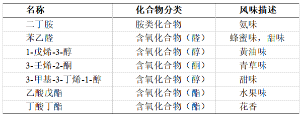 进一步构建指纹图谱,红色框中组分在样1~ 5中含量较高,例如1-戊烯-3-醇、苯乙醛、二丁胺等;黄色框中组分在样7、9、12、13中含量较高,例如乙酸戊酯、丁酸丁酯等;绿色框中组分在样6、8、10、11中含量较高,例如3-甲基-3-丁烯-1-醇等。