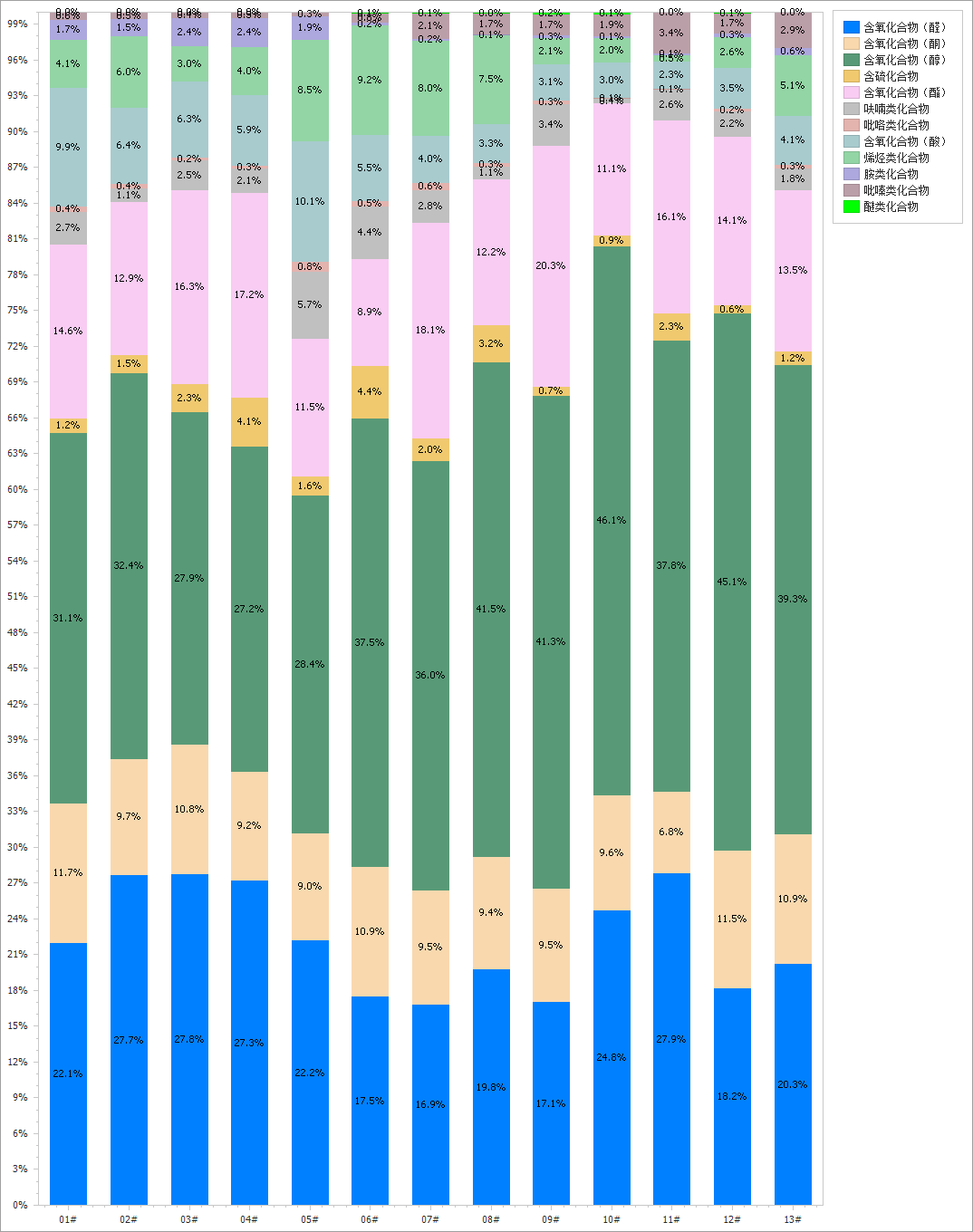 在各样品主要组分中,醇类化合物含量占比最高(27.2%~46.1%),依次为醛类化合物(16.9%~27.9%)、酯类化合物(8.9%~20.3%)、酮类化合物(6.8%~11.7%)、酸类化合物(2.3%~10.1%)和醚类化合物(0.5%~9.2%)。呋喃类化合物、含硫类化合物、胺类化合物等含量占比在5%以下。在样1~样5中,胺类化合物含量占比在2%左右,同时吡嗪类化合物占比较低。相反地,样6~样13中,几乎不含有胺类化合物,吡嗪类化合物约2%。