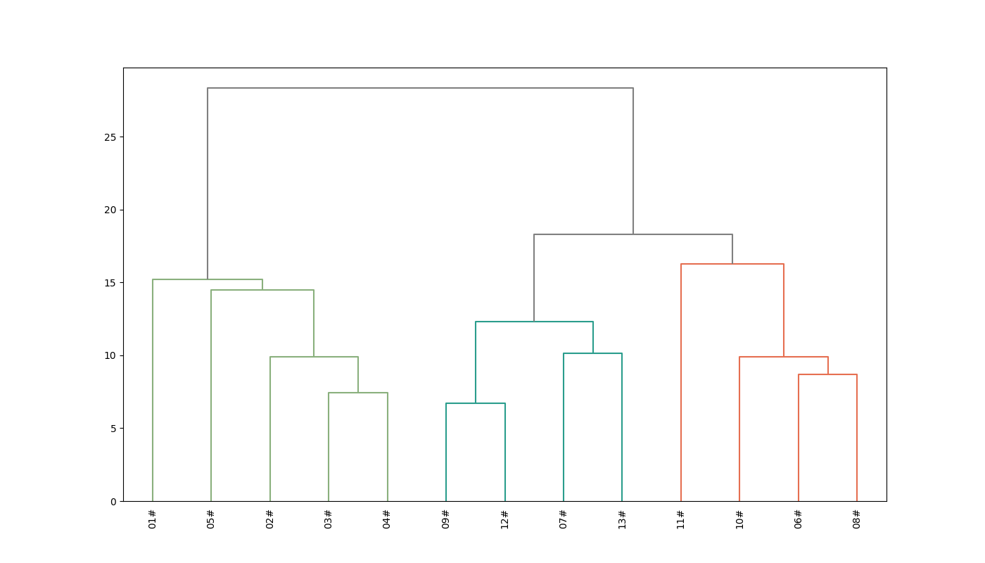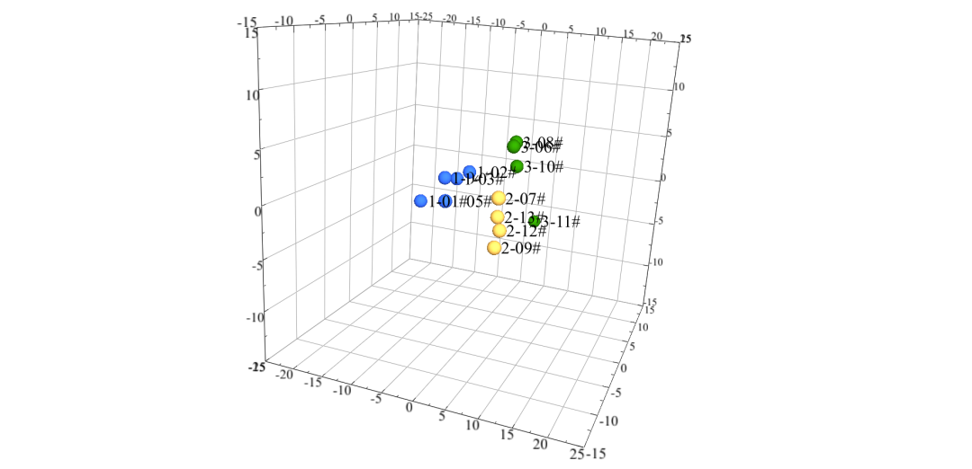 同时进行主成分分析,获得三维PCA图。三个主成分包含大部分原始信息,可以代表原始数据进行解释。根据PCA结果,样品1~5具有相似性,样品7,9,12,13具有相似性,同时样品6,8,10,11具有相似性。PCA结果与HCA结果一致。13个样品被划分为三类。