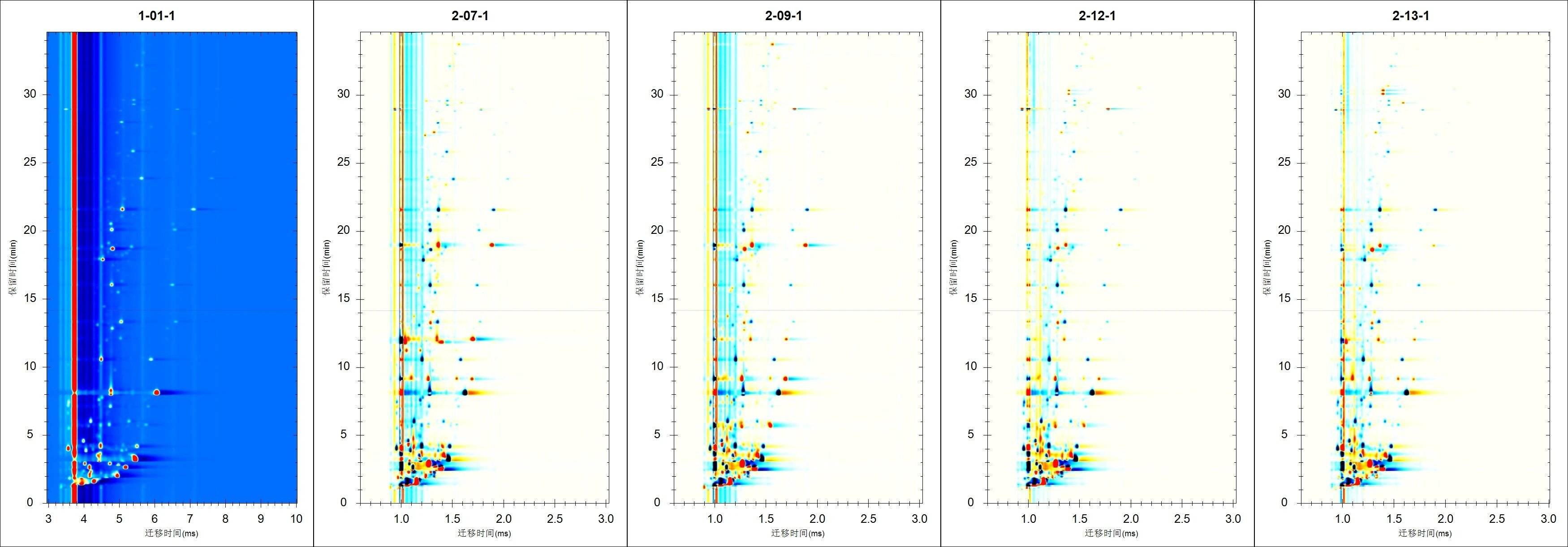 对样品间差异进行比较,以1号样品作为参考,生成差异谱图。样品2~5中谱图组分分布与1近似,颜色差异主要由于样品组分浓度不同。样品6~13中谱图组分分布在低沸点区域与1存在明显差异,这部分主要由于组分种类存在差异。